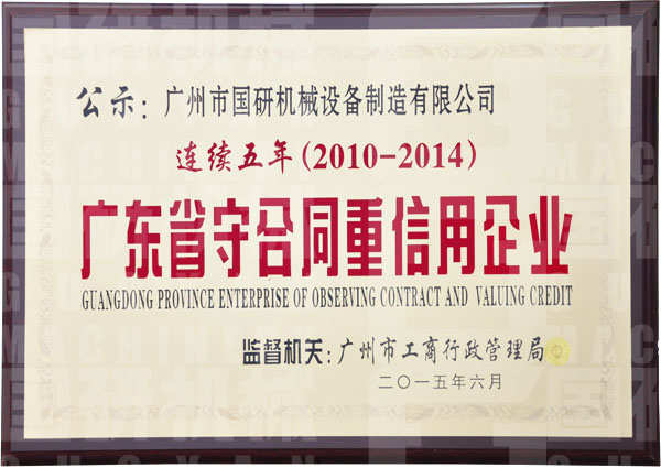“连续五年(2010-2014)广东省守合同重信用企业”的牌匾在广州市安博网页版设备制造有限公司的文化展示墙上格外引人注目,这是对公司多年坚持诚信经营的充分肯定,也是公司企业文化“诚信、创新、分享、精进”的客观体现。